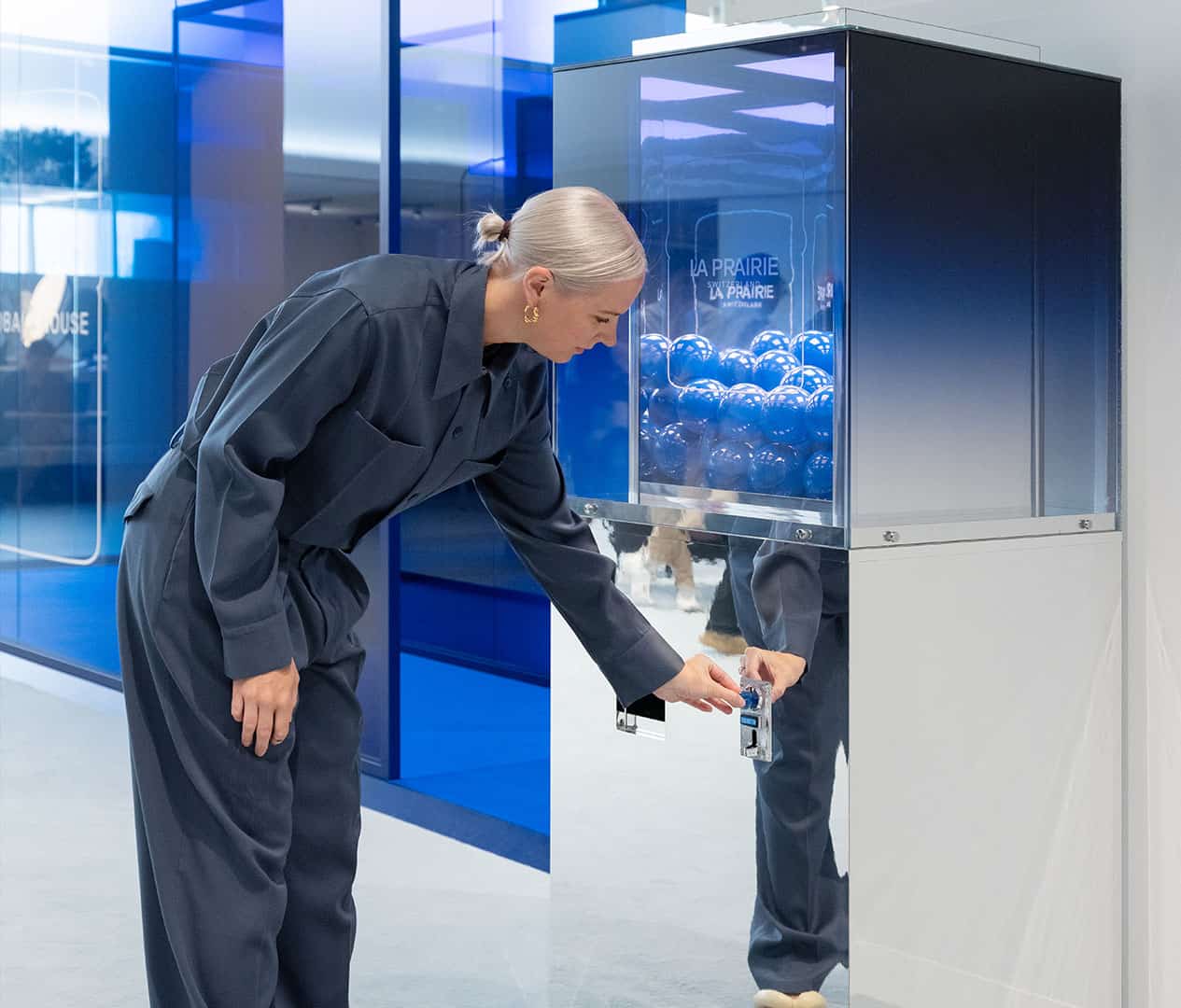 Marking the 7th year of La Prairie’s involvement with Art Basel, La Prairie partnered with award-winning designer Sabine Marcelis to create the Cobalt House – an immersive and sensorial design space where guests could enjoy bespoke skincare treatments. Phygital were proud to support this outstanding installation by creating a completely bespoke Vending Machine to give product samples to every guest that visited this unique space. From the use of materials to blend with the installation and brand, to the physical vending mechanism and control; every part of the unit was painstakingly developed from scratch. The unit itself was wonderful to look at, with high end materials and glass – a true art piece in its own right. The clever use of mirrors and lighting gave a surreal infinity effect for anyone looking into the machine.